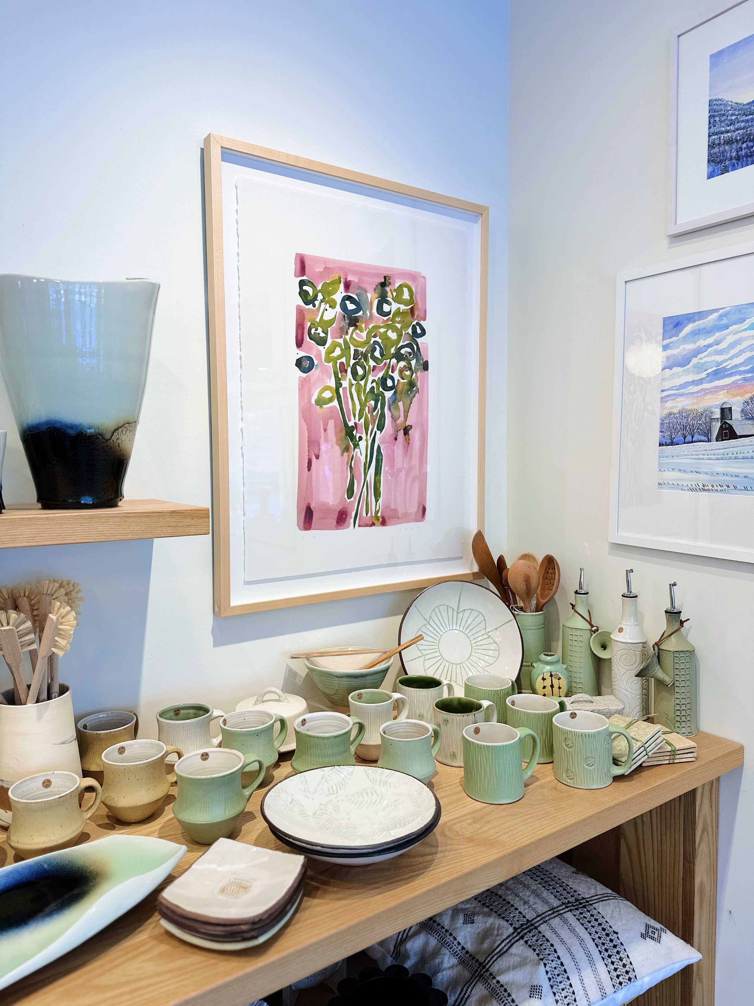 Attached to our studio we have a gallery and shop. In it you will find pottery (obviously!) as well as other items for your home and self. We have a lovely selection of linen kitchen towels, baskets, soaps and other apothecary items, Jewelry, hand carved wooden spoons, paintings and other 2 dimensional art, candles, greeting cards and textiles. All pottery we sell is made either by our members or our instructors.